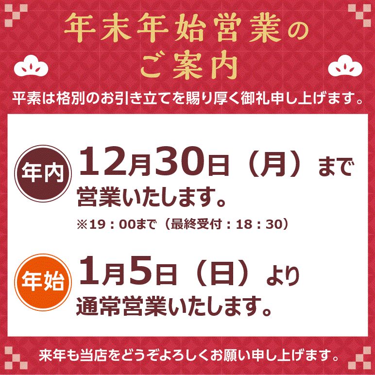 今年もお世話になりました。年末年始の営業時間のご案内 2024年12月30日 いつも当店HPをご覧いただきありがとうございます。 今年も多くのお客様へご来店いただきました。 心から感謝申し上げます。 今年の営業は本日12月30日が最終日になります。 営業再開日は2025年1月5日(日)AM10時30分~になります。 来年度も宜しくお願い致します。 タイヤ館一宮バイパス スタッフ一同