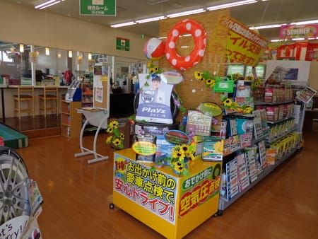 【夏コーナ】展示変更 ポスト 2016年7月9日 皆様いつも当店HPご覧いただき誠にありがとうございます。タイヤ館一宮バイパスです。今回は、当店スタッフが早くも梅雨コーナーを撤去!!そして、夏のコーナーにしてくれました(^O^)当店は、いち早く夏です。 夏のお出かけ前に、タイヤ・オイル他交換しませんか?「本当に交換が必要かな?」無料点検も実施中です。お気軽にご来店ください!!