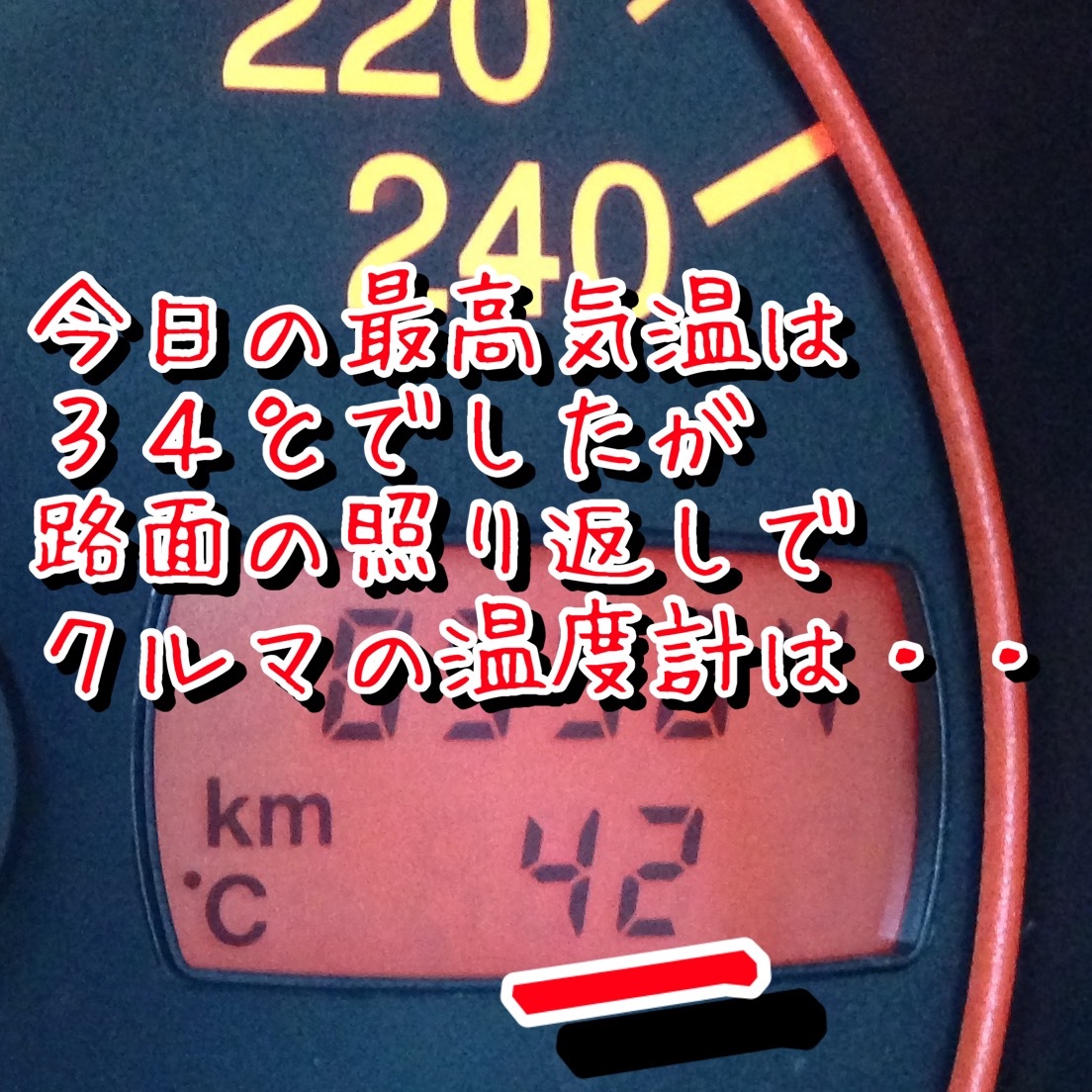本日の最高気温は34℃。これがクルマの温度計だと、路面温度の関係でさらに高く「42℃」!