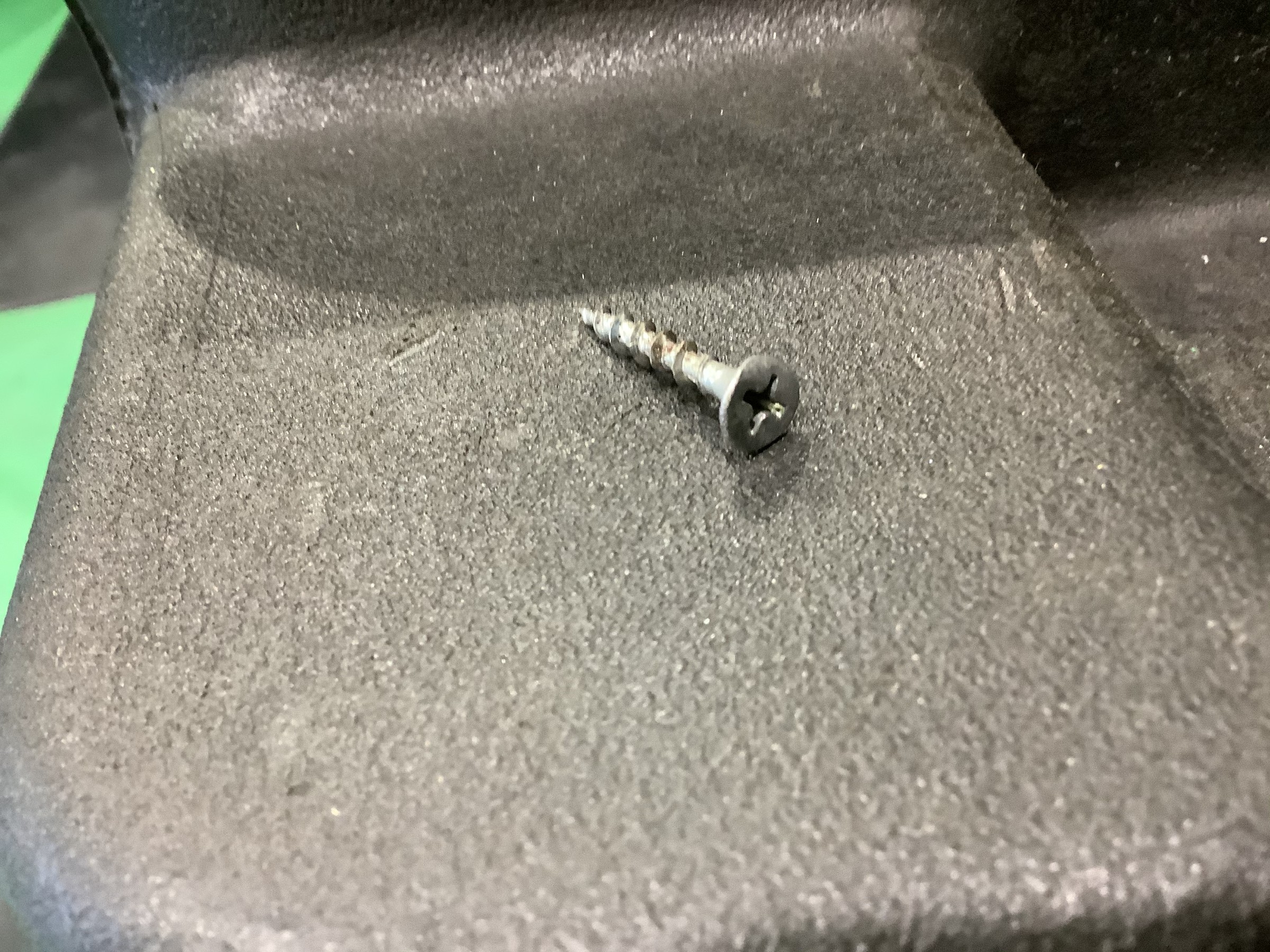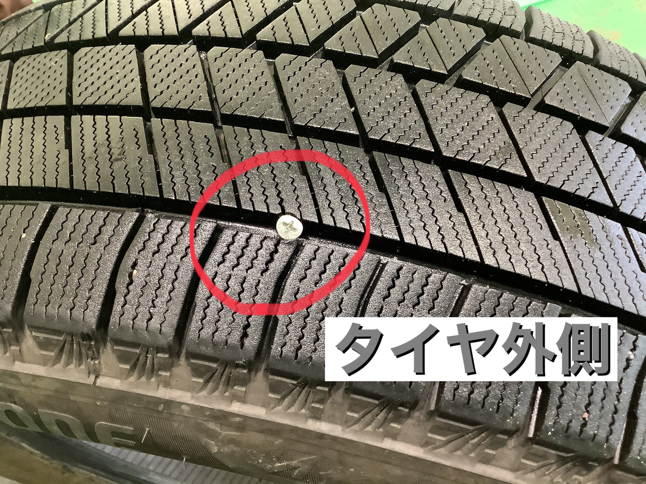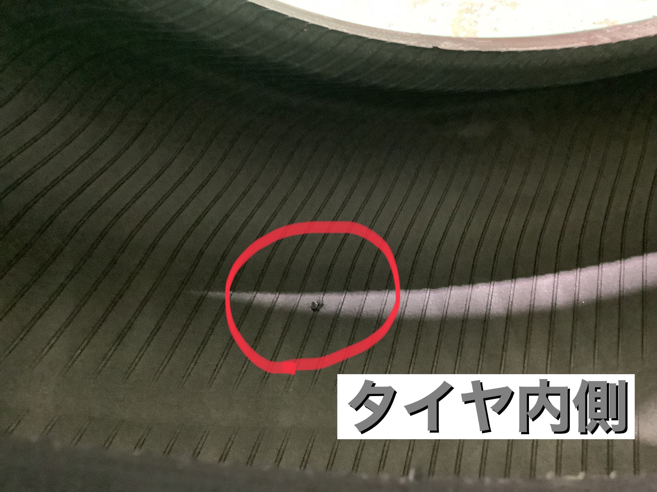 点検の結果、タイヤのトレッド面に釘が刺さっているのが原因でした。