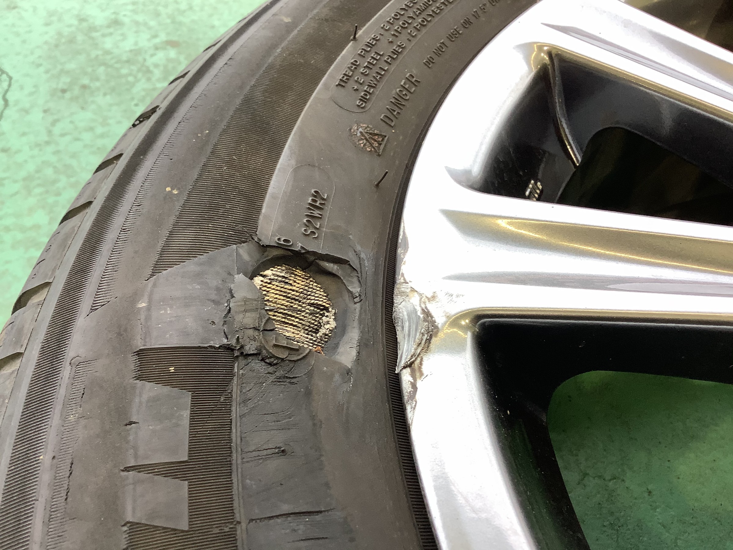 タイヤの側面をぶつけてしまい、バースト寸前でした。