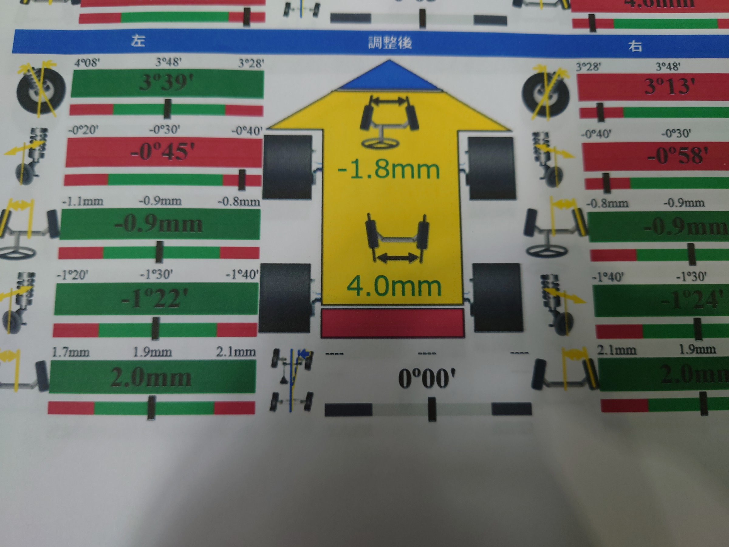 測定してみると、リアのトー及びフロントトーのズレが大きかったので調整しました。