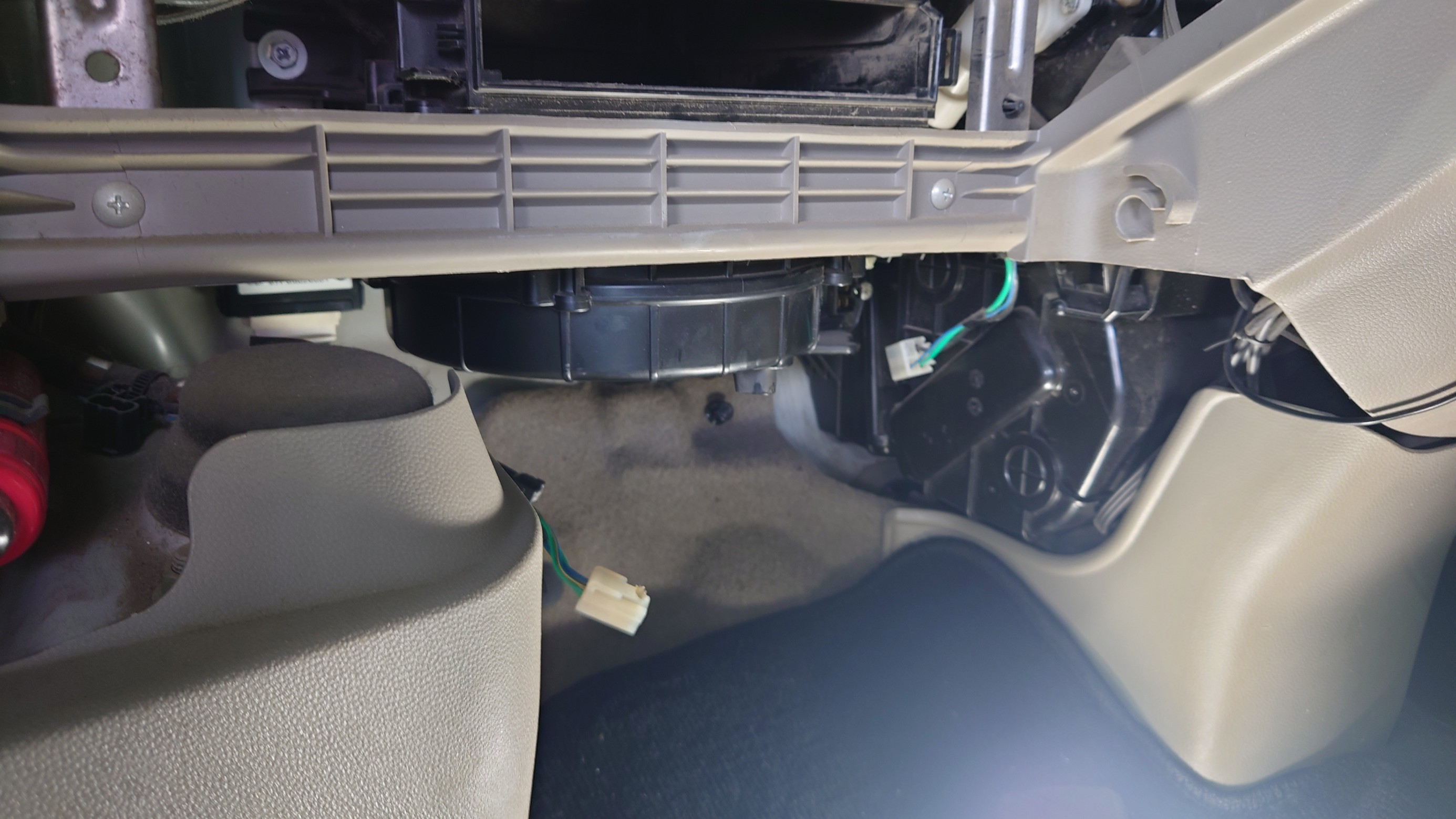 エバポレーターの内部にアクセスする為、ブロアーファンという風を送る装置を外します。