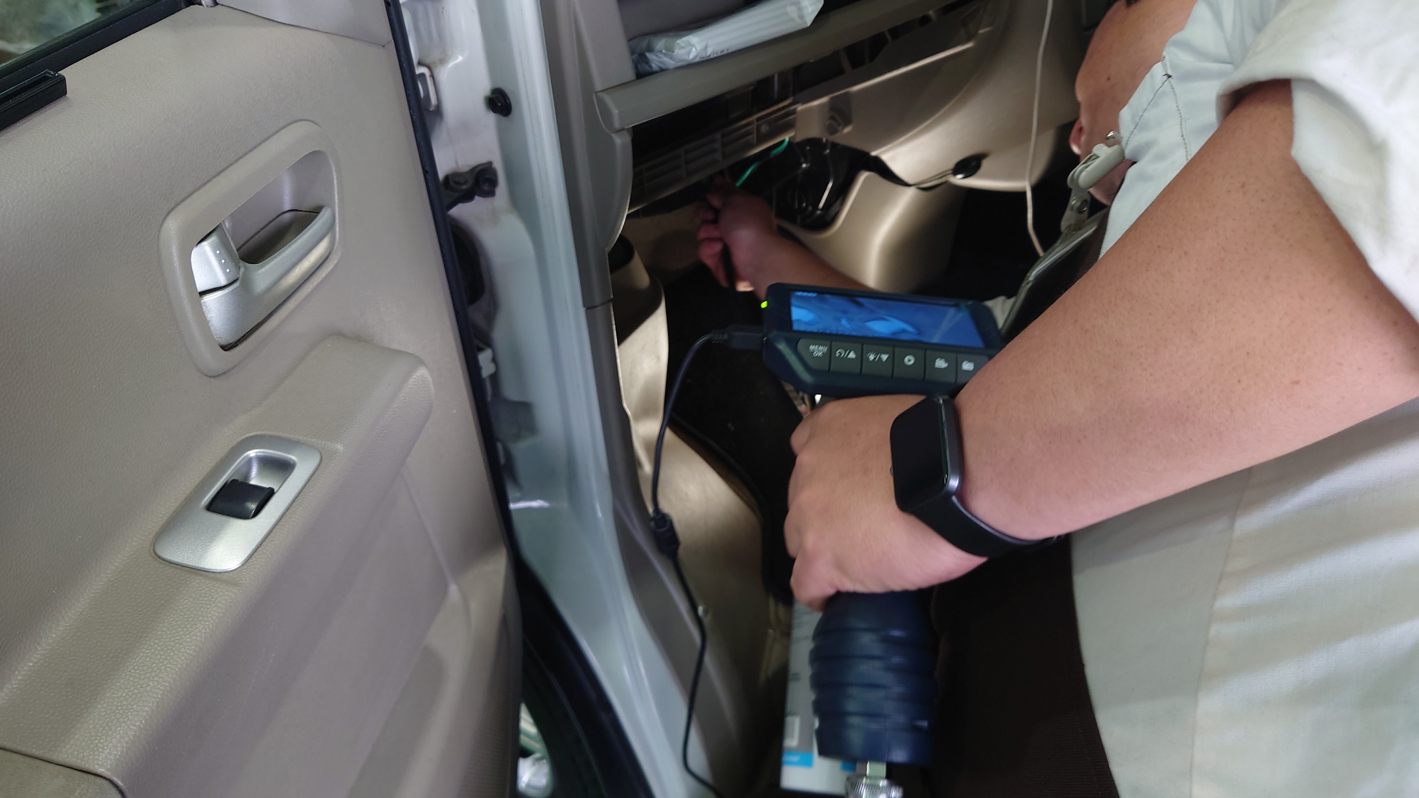 マイクロスコープを使い、エバポレーターの位置と汚れ具合を確認します。