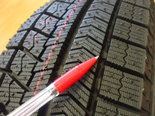 ペンの先の溝の中に出っ張りが見えるかとおもいますが、こちらがスタッドレスタイヤの溝の残りを表す