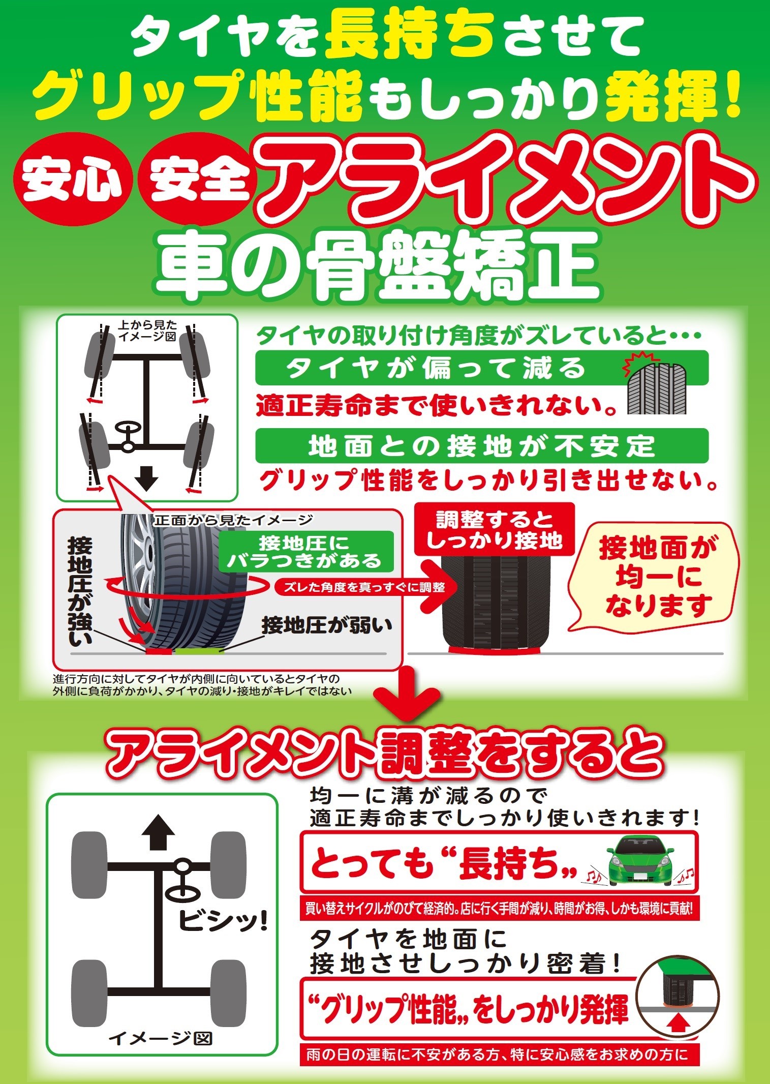 タイヤの走行性能をしっかりと発揮させるためにも、アライメント作業は大事なんですよ。タイヤ長持ちのためにも、そして本来の性能を発揮させるためにも、定期的なアライメント測定・調整をおすすめします。