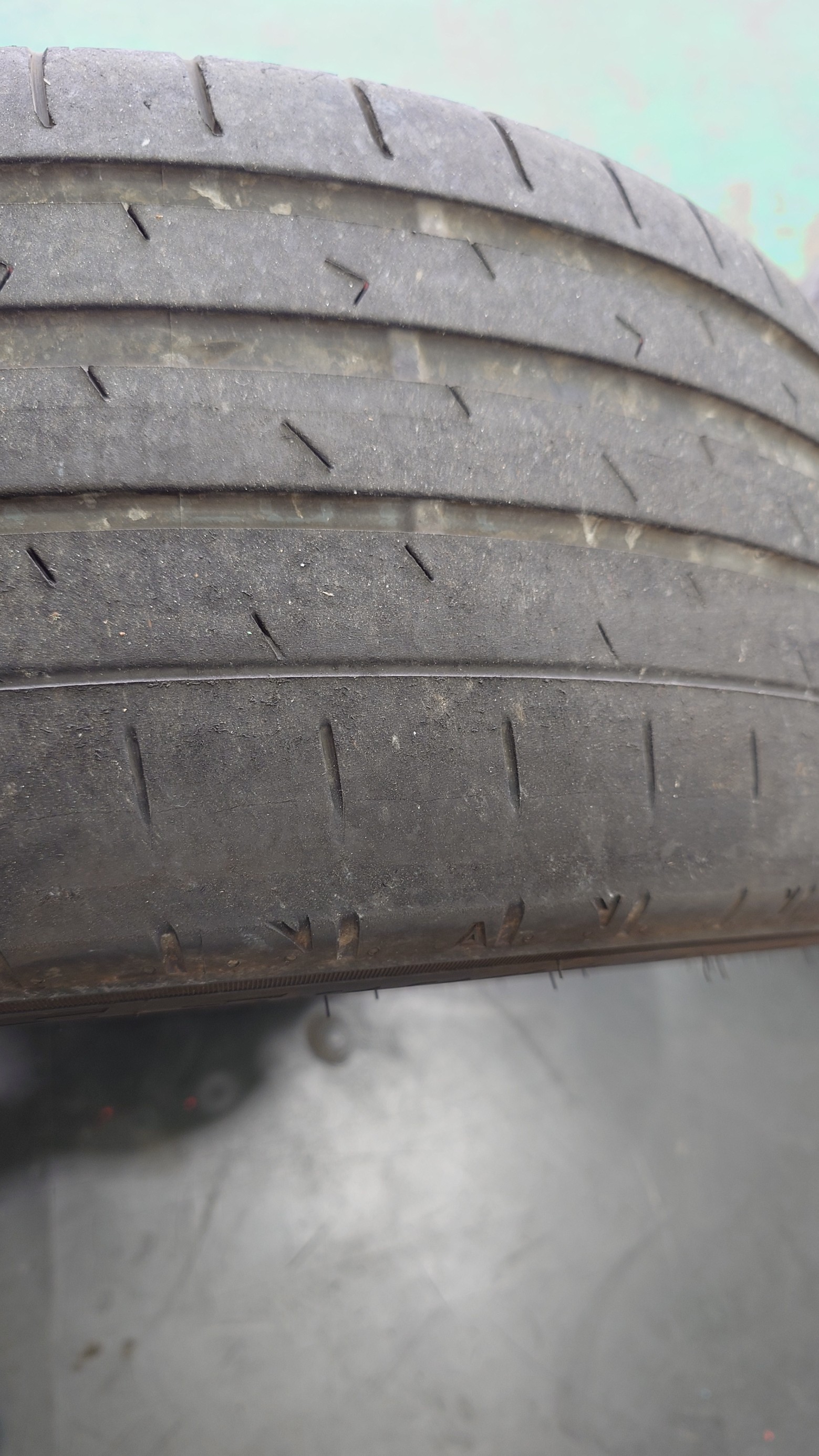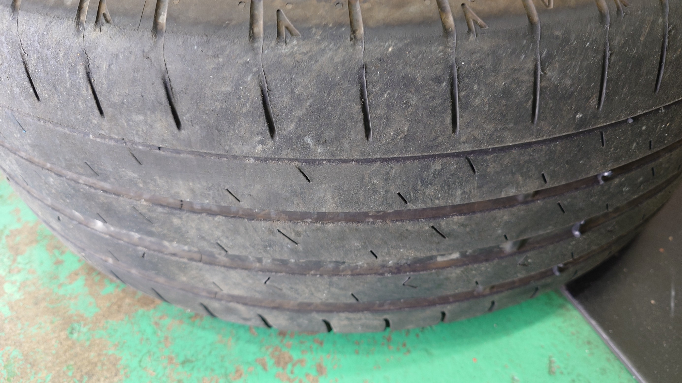 最初は、アライメント調整のみをご希望されていましたが、タイヤの状態をみて今回はフロント2本も交換させていただきました。