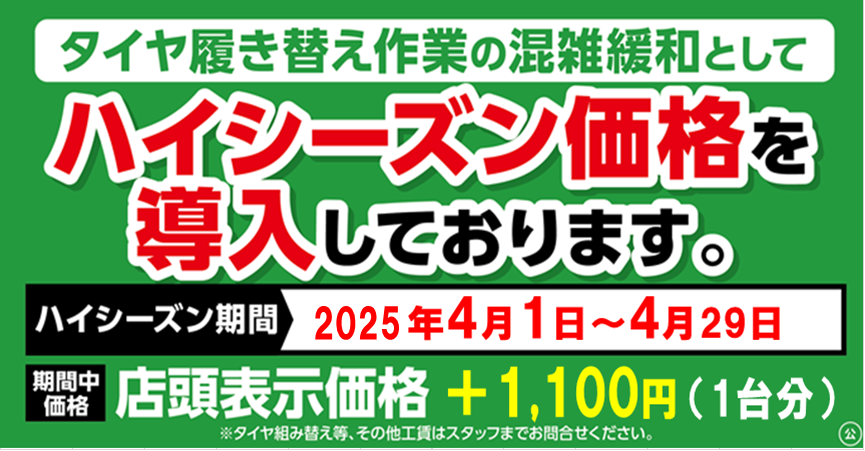 いつもタイヤ館一関を御愛顧頂き誠に有難うございます。 昨年、タイヤ交換繁忙期でもある11月に県内タイヤ館で実施しました タイヤ交換作業料の『ハイシーズン価格』が春のタイヤ交換時期にも同じように導入することになりました。 期間は2025年4月1日~4月29日までとなります。 期間中...