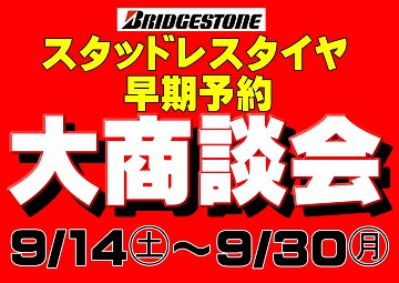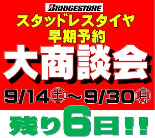 こんにちは! 三連休、大商談会の沢山のご来店 誠にありがとうございました! しっかりと準備させて頂きます! 大商談会は、9月30日までとなります。 スタッドレスタイヤをご検討の方は どうぞこの機会にご予約下さい! 明日、水曜日は定休日となります。 19日木曜日はレディースデイとなっており...