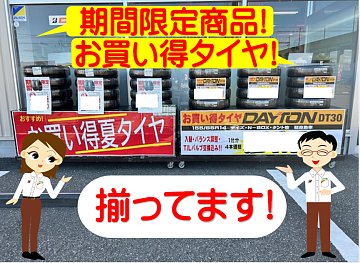 こんにちは! 夏季休業を頂いておりましたが、 今日から営業しております!! お出かけで頑張った愛車の 無料点検!是非いらして下さい(^^) そして、8月後半は、 お買い得タイヤ揃えております! 是非この機会にご利用下さいませ。