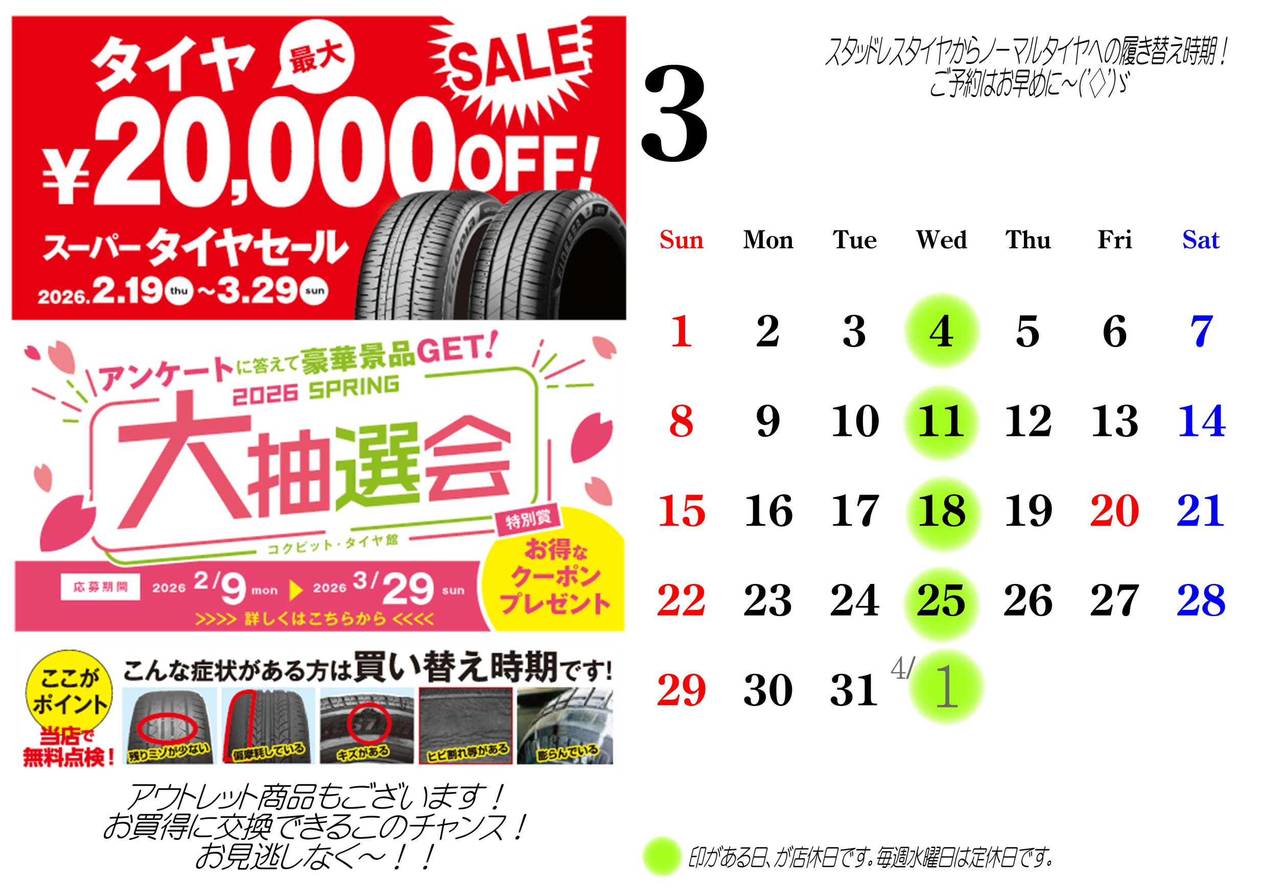 3月の定休日 2026年3月1日 タイヤ館 飯塚店のWEBをご覧いただきありがとうございます 毎週水曜日は定休日です 営業日へのご来店おまちしております! AM10時~PM18時30分まで 最終の作業受付時間は18時です お昼13:00~14:00はPITお昼休憩ですので ご理解とご協力をお願い致します 3月は 4日・11日・18日・25日が定休日です