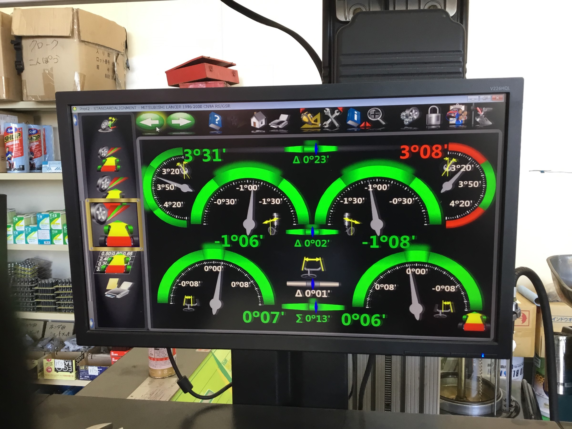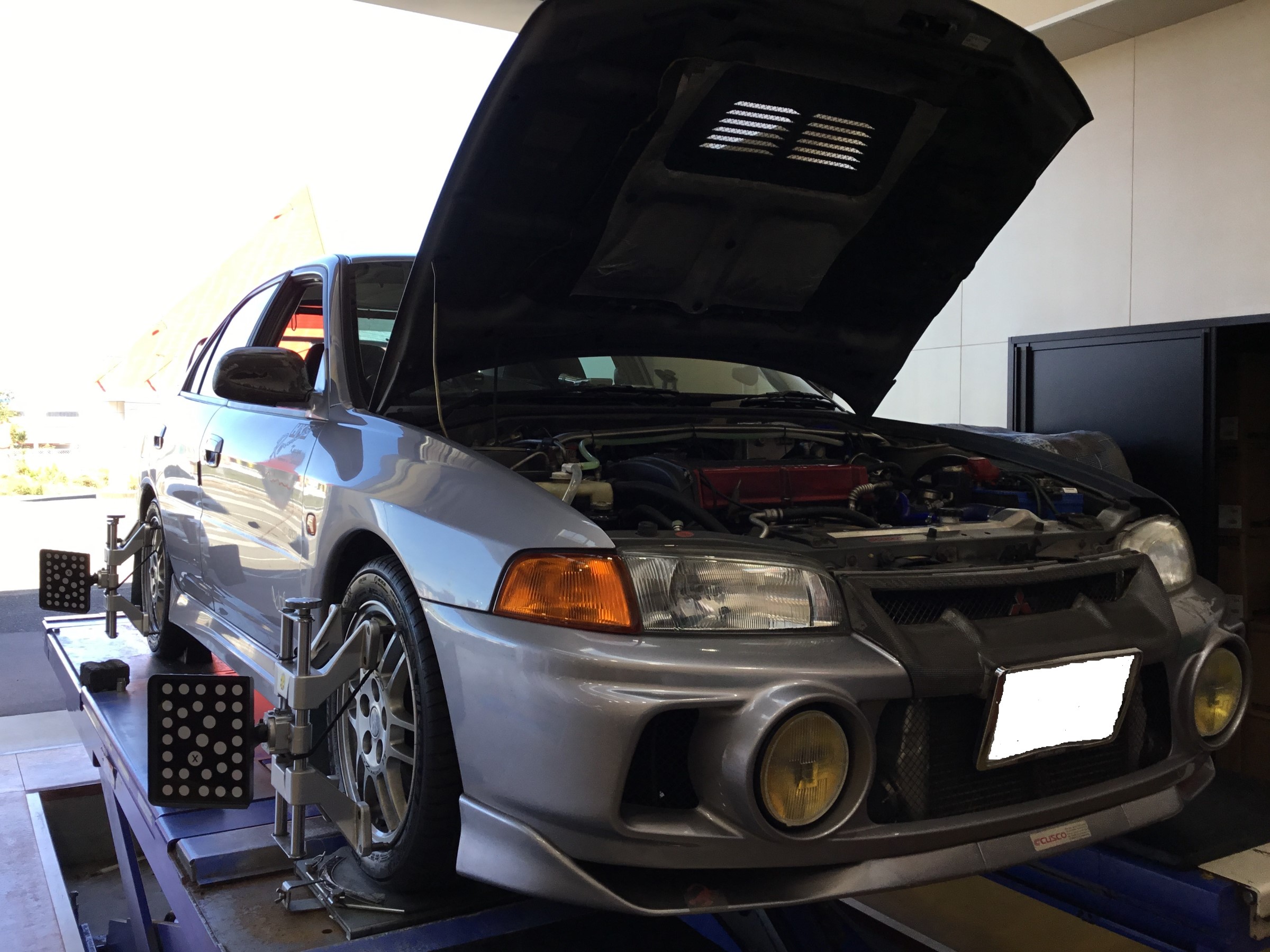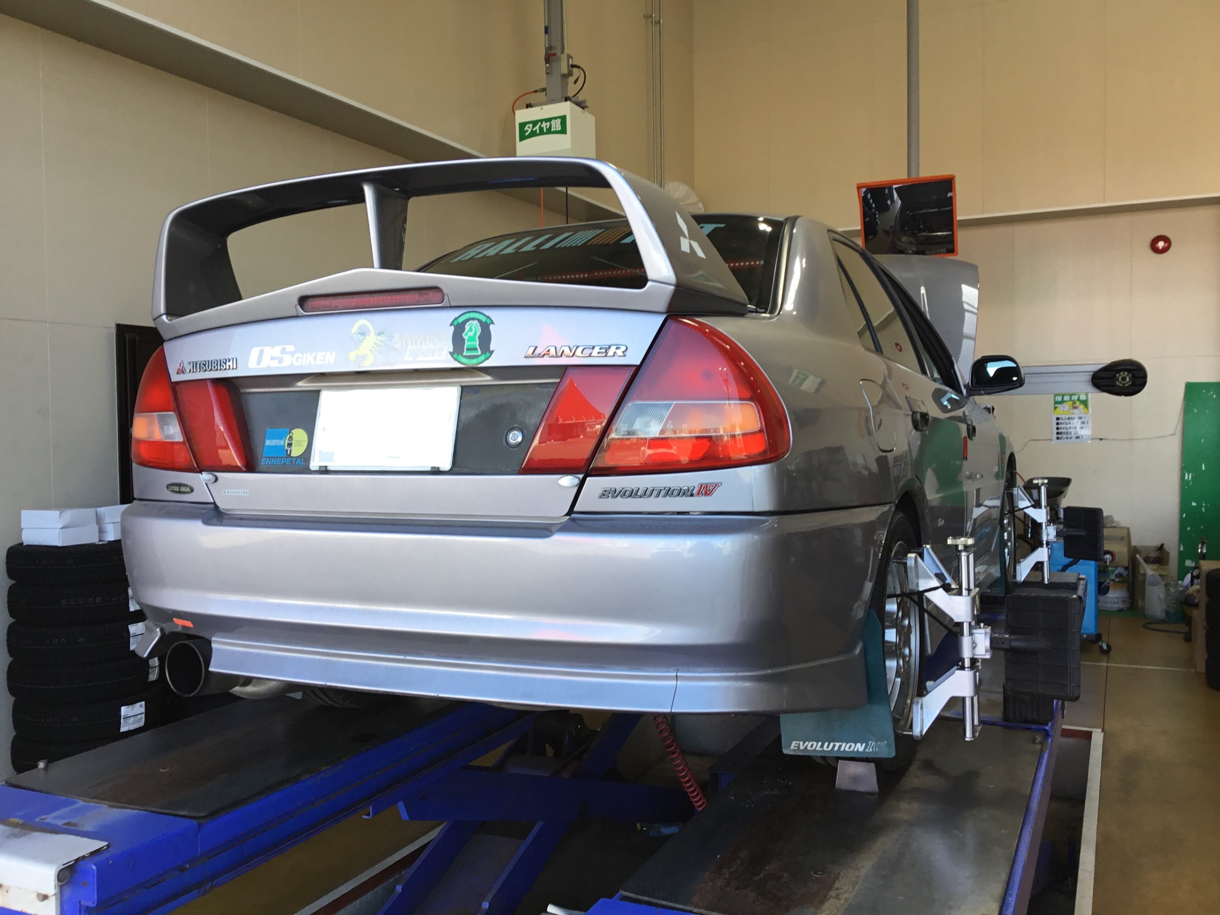 本日は 田川郡よりご来店のH様 三菱 ランサーエボリューションにアライメント調整実施しましたのでご報告いたします。