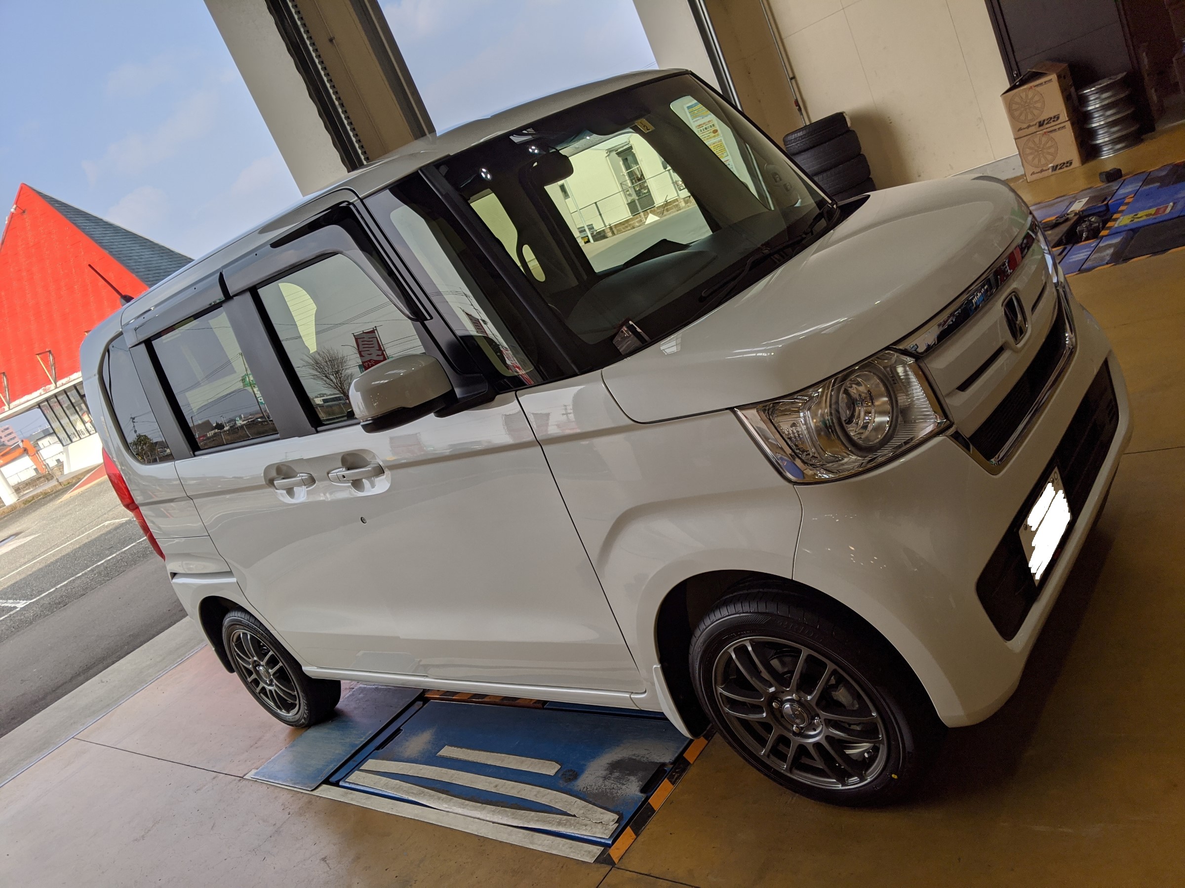 本日は、バリバリの新車のホンダ N-BOXカスタムに タイヤ・ホイール 装着しましたのでご報告でーす!