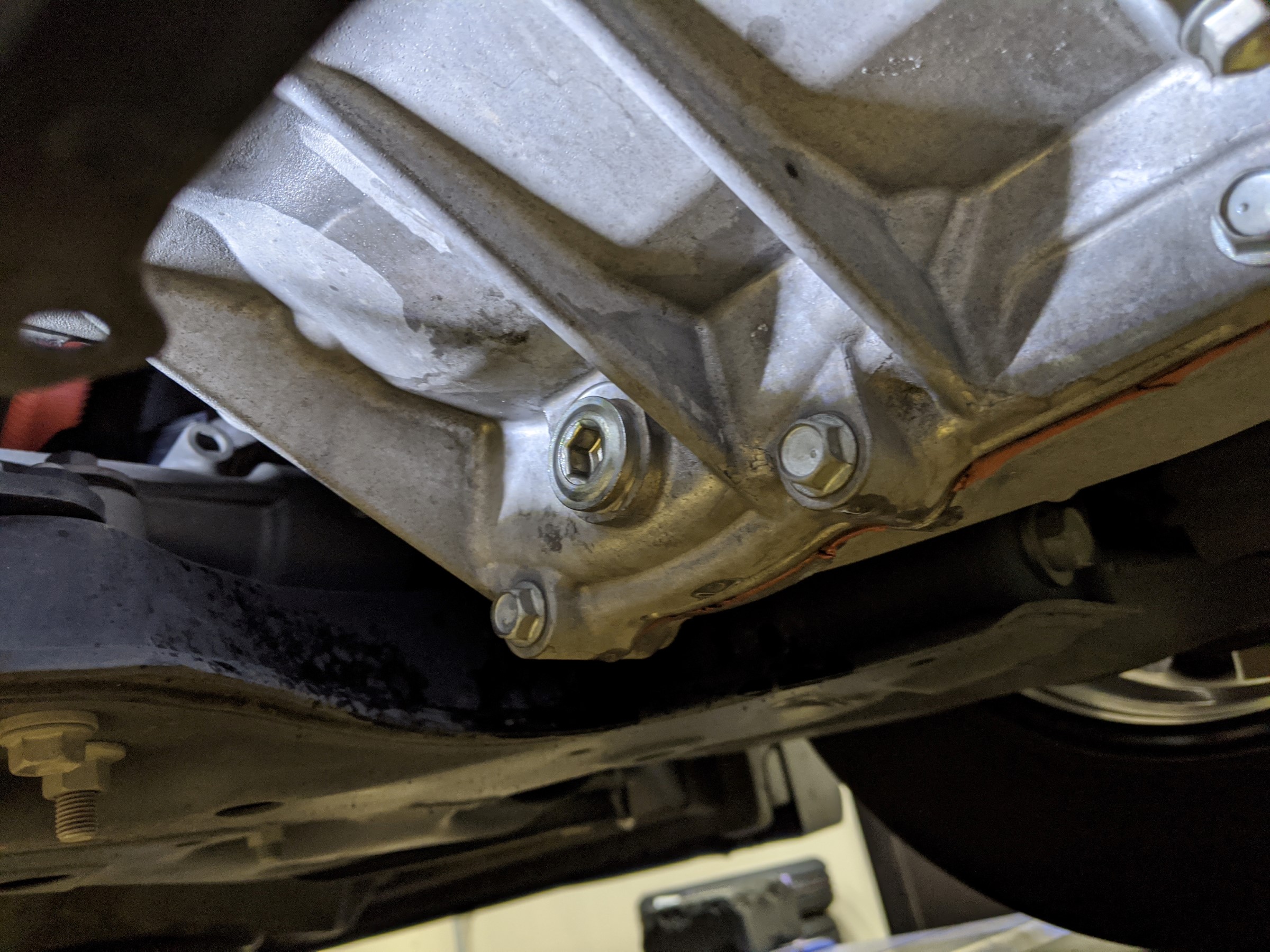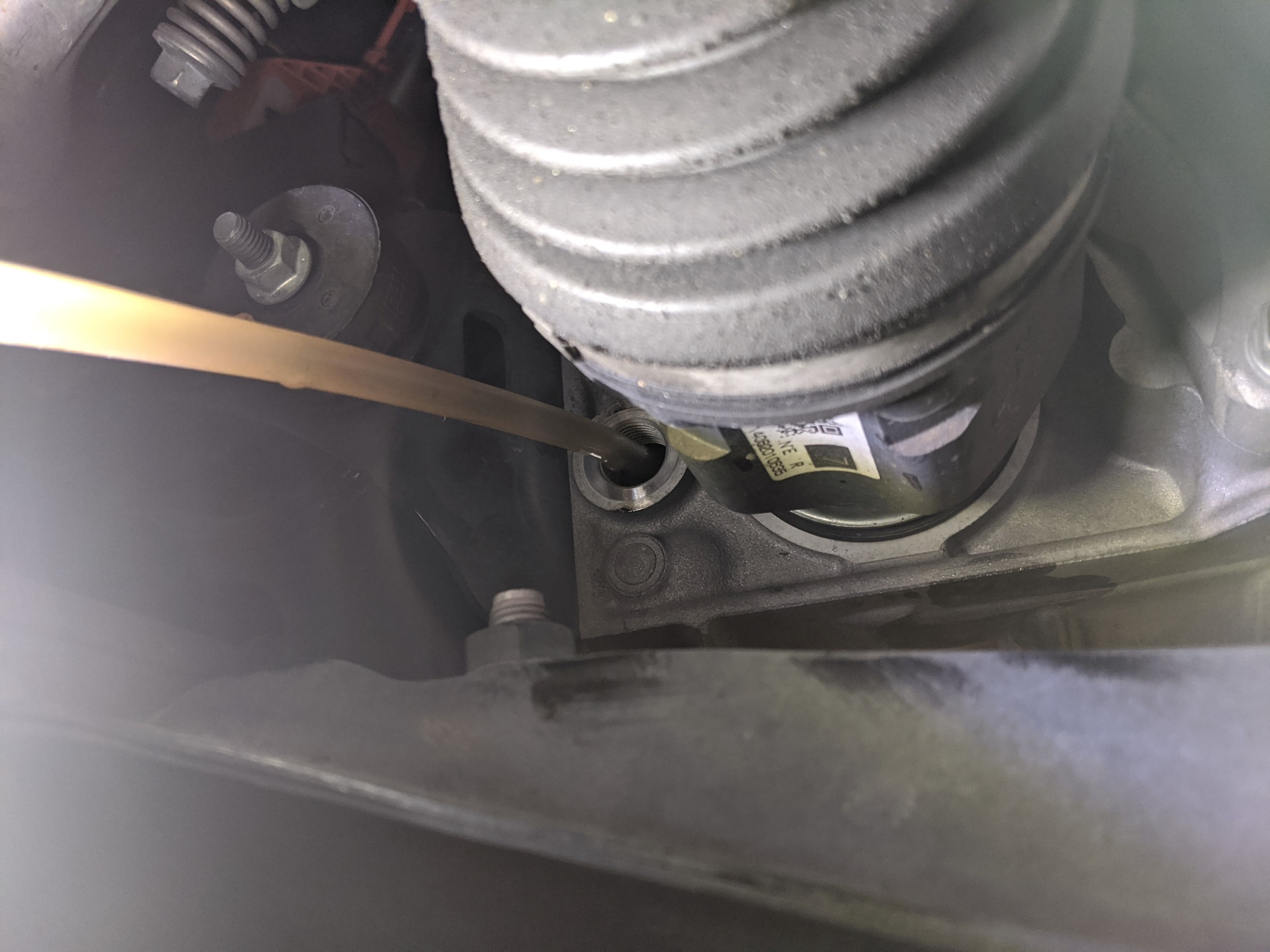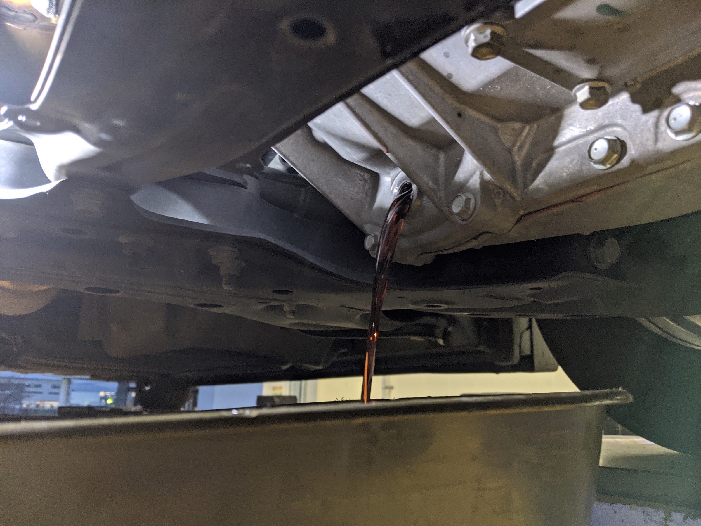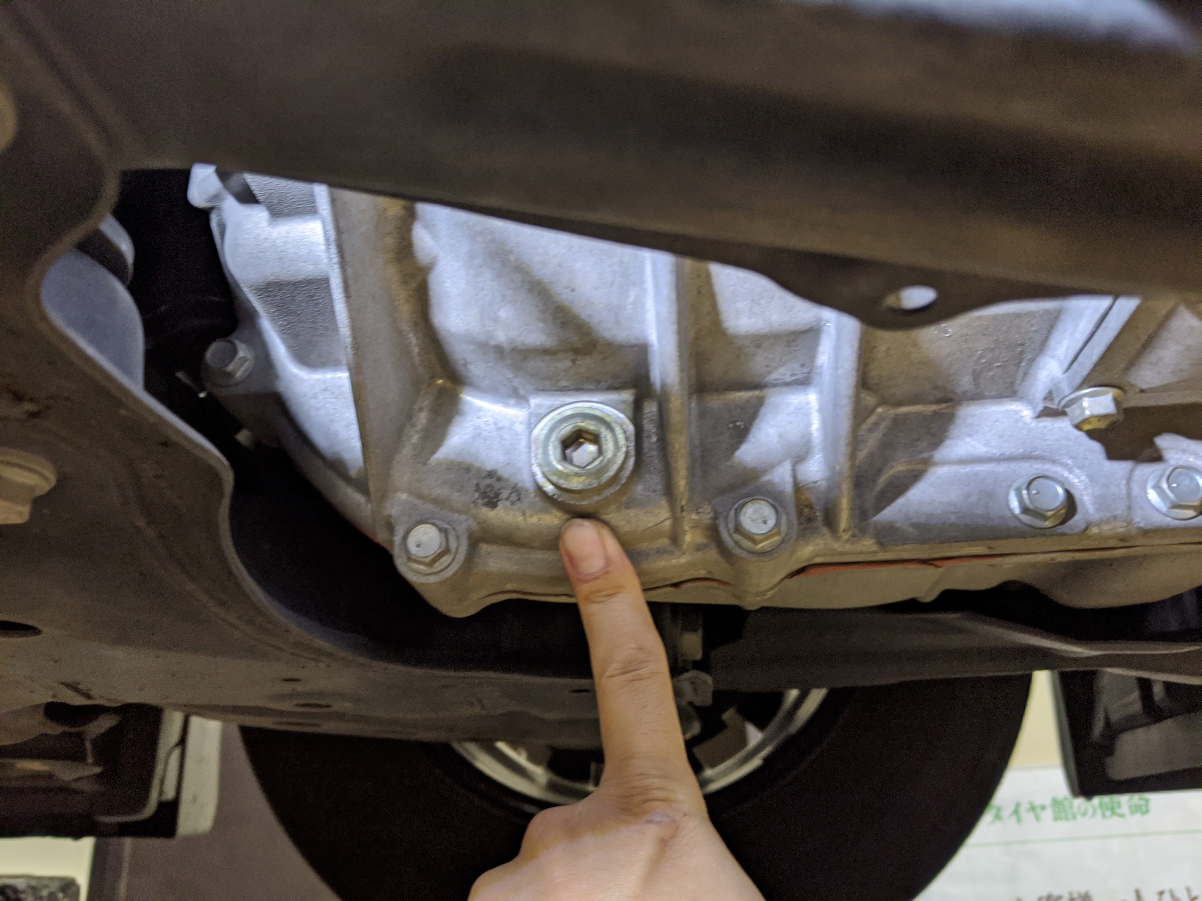 CVTオイルのドレンボルトは上下2か所にあります。上側が入れ口、下側が抜き口になります。