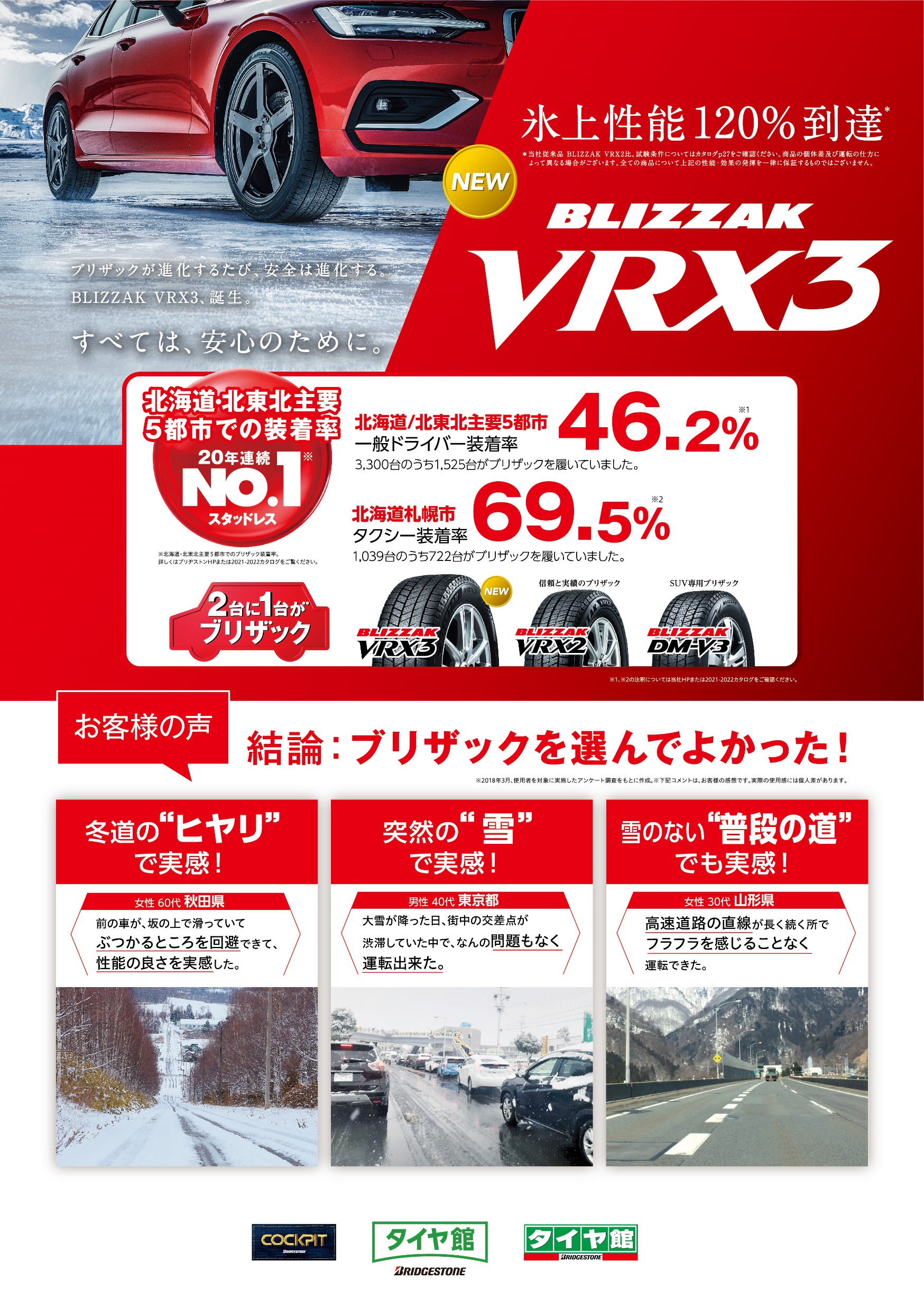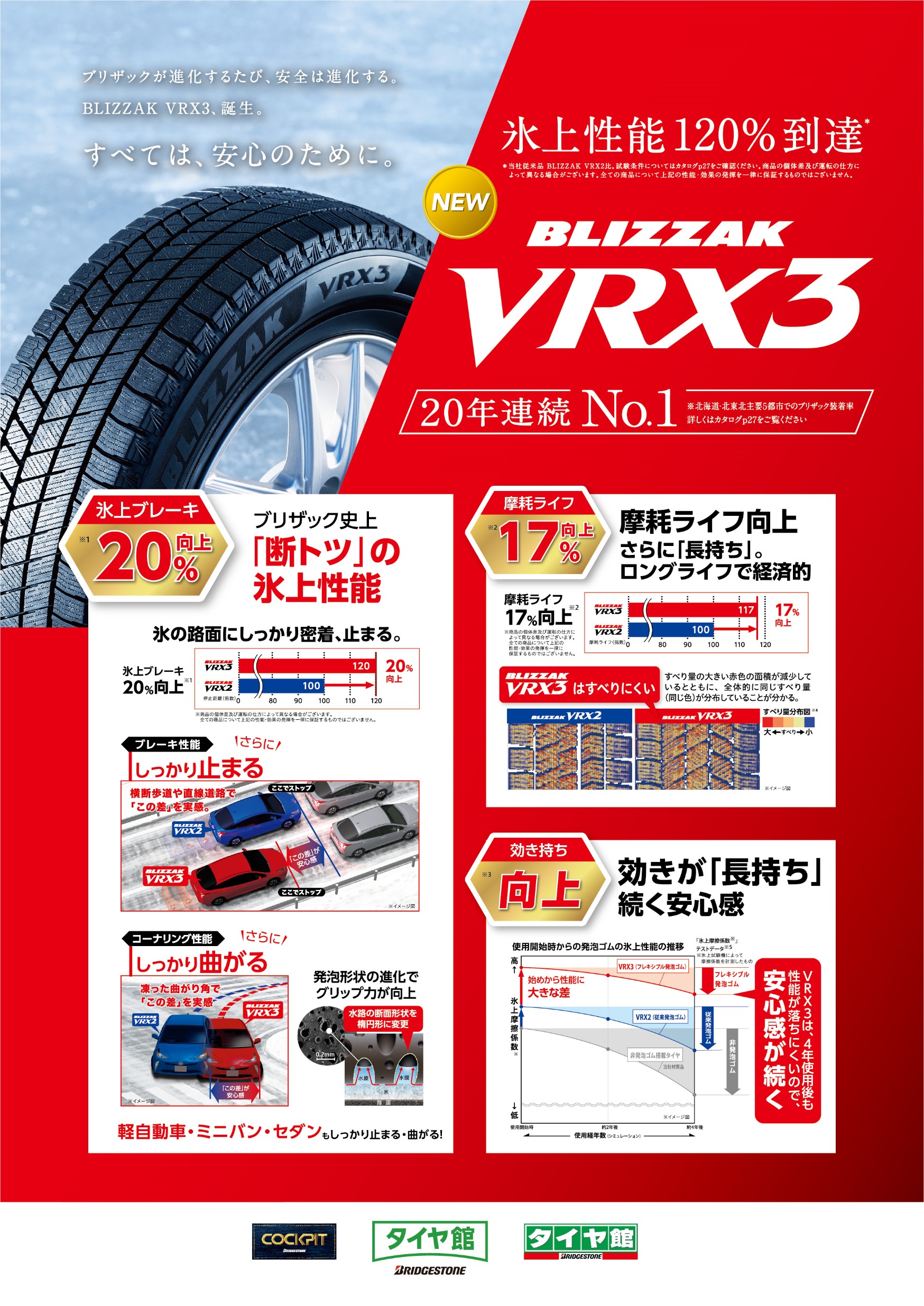 待望のブリザックVRX3 特別販売会開催中 冬タイヤはとにかく早めがお得! ポスト 2021年9月30日 ブリヂストンタイヤの直営店 タイヤ館伊川谷店では、 待望のブリザック VRX3の販売を記念して特別販売会を開催しております。 まだ、ちょっと早いな・・・・ いやいや。早くありません。 まずは、ブリザックVRX3 を見に来てください。 関連情報もあわせてご覧ください 詳しくはこちら カテゴリ:お知らせ