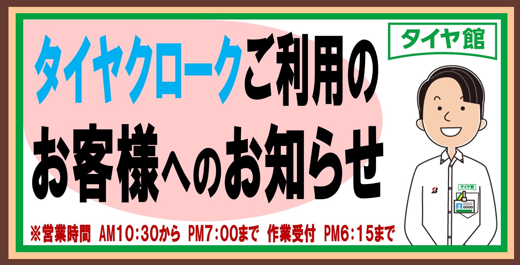 タイヤクロークご利用のお客様へ今年の最終便が22日までです。 ポスト 2021年12月3日 タイヤ館伊川谷店でタイヤクロークをご利用頂き誠に有難う御座います。 年内・12月最終配送日が22日依頼分が最終となります。 22日中にお電話頂ければ平日にはなりますが、年内取り付け可能で御座います。 年明けは7日以降のお取り寄せとなる為、お取り寄せは早めにご計画願います。 タイヤ館 伊川谷 電話. 078-978-0520 お店に電話する まずはお問い合わせだけでも!お気軽にお電話ください! カテゴリ:お知らせ