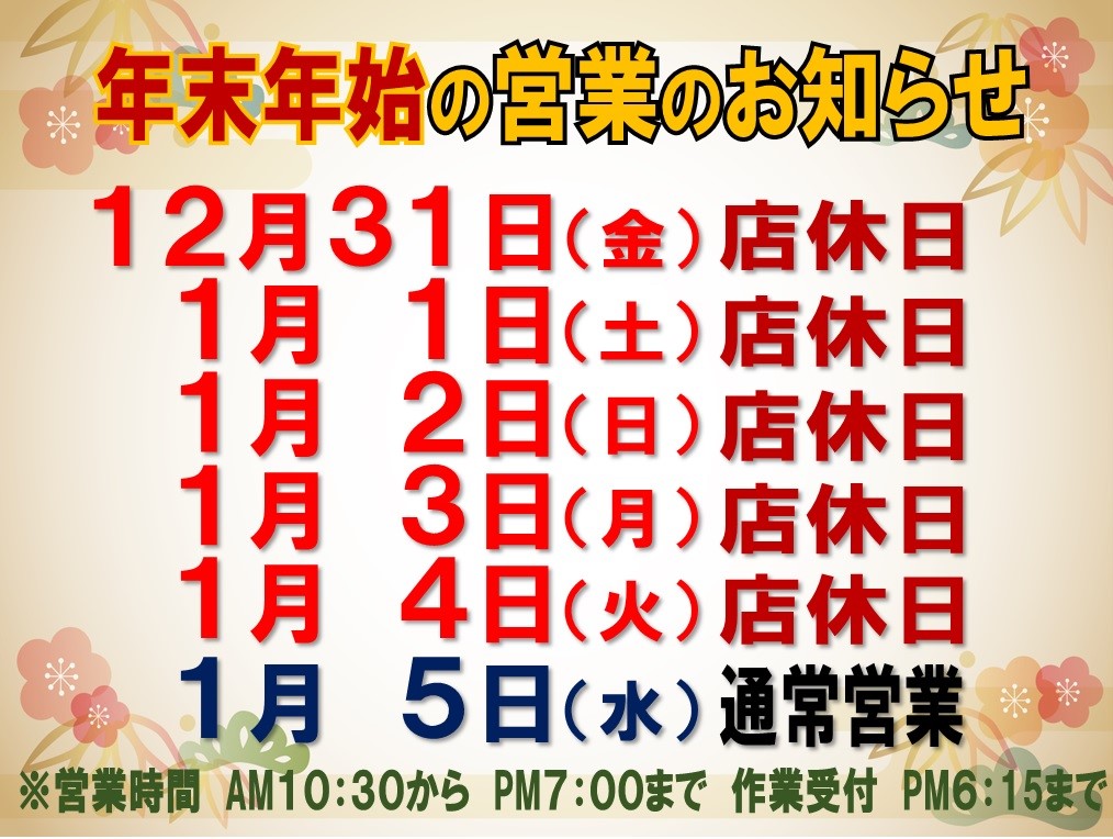 ★2021年もありがとうございました★ ポスト 2021年12月30日 本日 2021年 営業最終日となります!! 2021年もたくさんのお客様にご来店頂き、 誠にありがとうございました!! 2022年も変わらぬご愛顧、宜しくお願い致します!! 皆様のご来店をスタッフ一同、心よりお待ちしております♪ 皆様、良いお年をお迎えください‼ ※新年、初売りは1月5日より通常営業です。