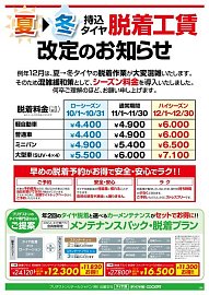皆様こんにちは! タイヤ館池田店です! いつも当店のWEBサイトご覧頂き誠にありがとうございます。 当店でタイヤの履き替えをご利用のお客様へのご案内になります! 脱着シーズン混雑緩和の為 10月2日(木)〜10月31日(金) 12月1日(月)〜12月30日(火) 上記期間の冬タイヤへの履き替え料金が変更致し...