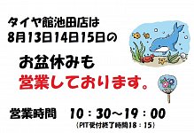 いつもタイヤ館池田店をご利用いただきありがとうございます! 当店では8月13.14.15日のお盆休みは営業しております! お盆休み中のパンクやバッテリートラブルなどは カーディーラーさん等行きつけがお休みしていてこまっている。。。 という方が多いです。 当店では緊急対応も行っておりますので ...
