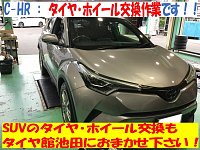 こんにちは~(^_-)-☆ 本日のタイヤ館池田のPIT作業ご紹介です! 本日のご紹介車両は… 「トヨタ:C-HR ZYX10」 作業内容は「タイヤ・ホイール交換作業です!!」 コンパクトSUVとして人気のC-HR。 軽快さと力強さを併せ持った車ですよね! クロカンSUVにはないスポーティさが魅力的(^^)/ 今回タイヤ...