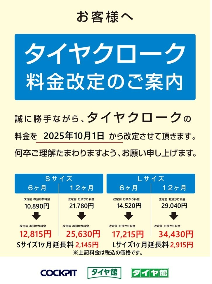 タイヤクローク料金改定のお知らせ【2025年10月1日より値上げになります】