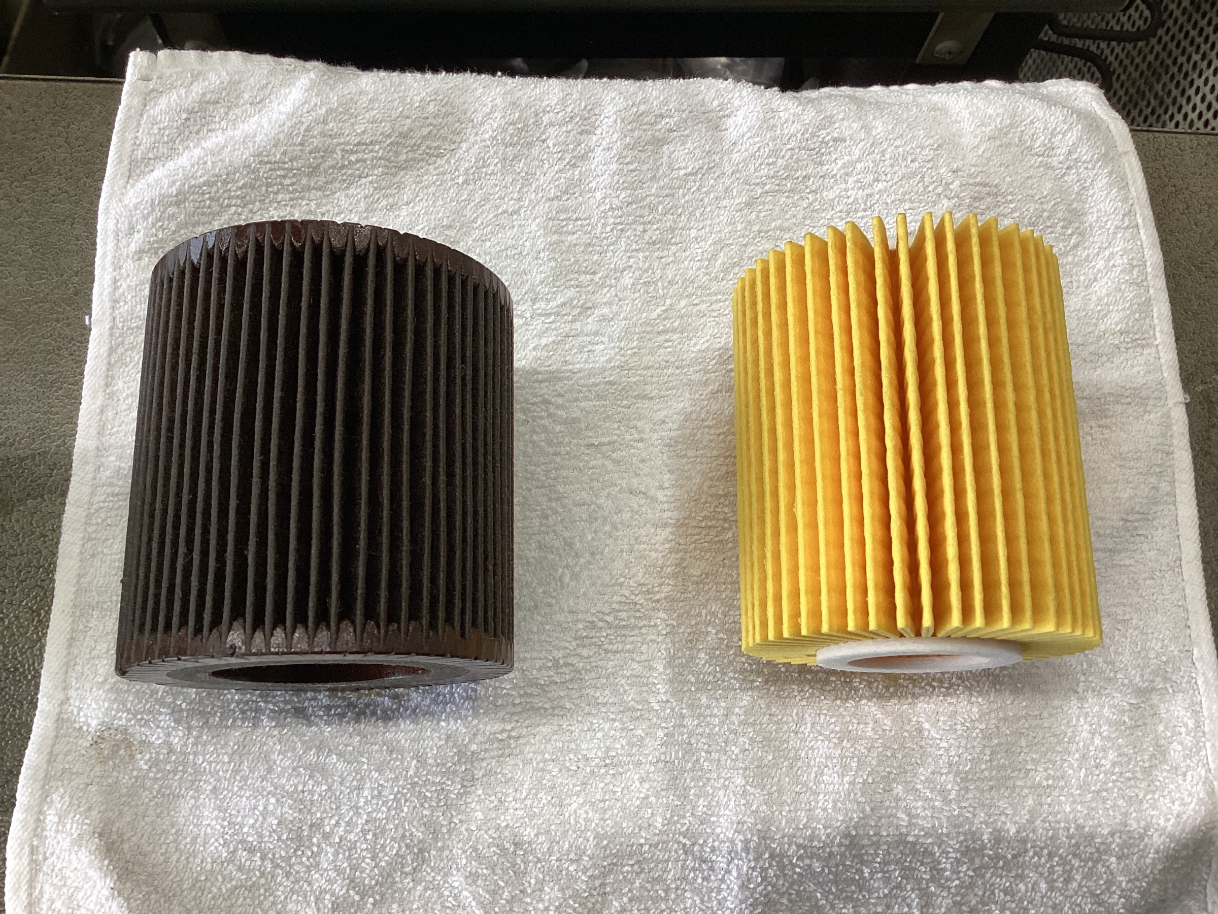 (左側がオイル交換2回したフィルターで、右側が新品のフィルターです。)