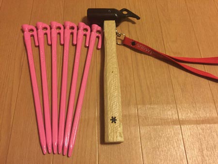 画像:ピンクの塗装を施した鍛造ペグとスノーピークのペグハンマー
