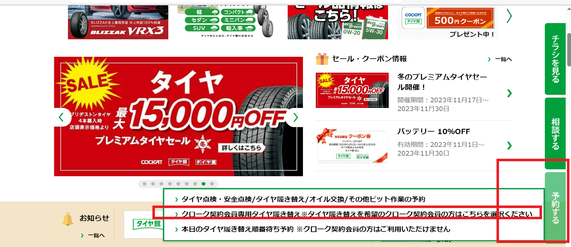 タイヤ館池上のHPやコクピットタイヤ館オンラインストア等からのご予約についてですが、
