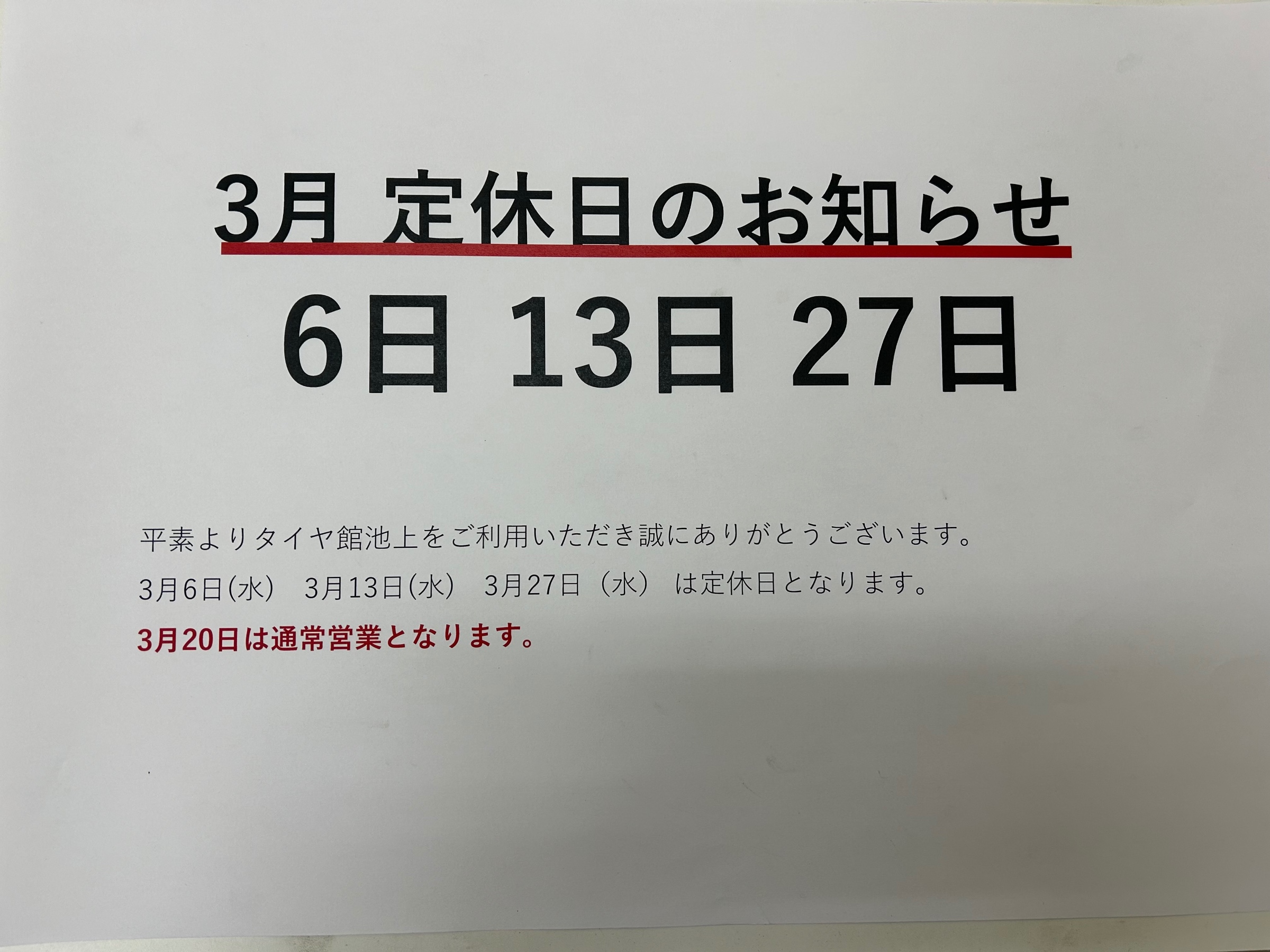 3月の定休日のお知らせ ポスト 2024年2月29日 3月の定休日のお知らせになります 皆様のご来店お待ちしております 3月6日 (水) 3月13日 (水) 3月27日 (水) 3月20日は水曜日ですが通常通り営業となります。 カテゴリ:お知らせ