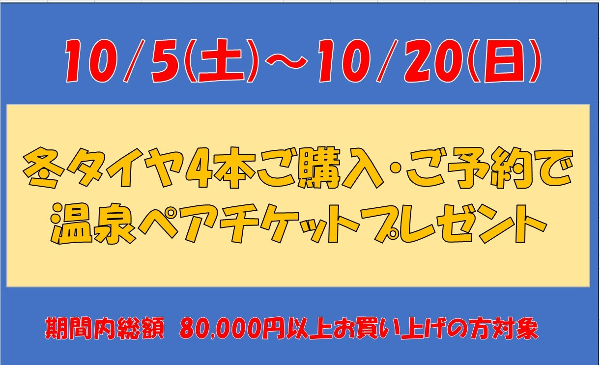 冬物早期割引イベント 先着25名 冬タイヤ4本予約購入で温泉ペアチケットが貰えるかもキャンペーン