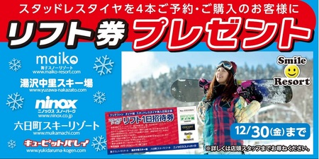 スタッドレスタイヤお買い上げのお客様にも、毎年恒例の「リフト券プレゼント」企画も