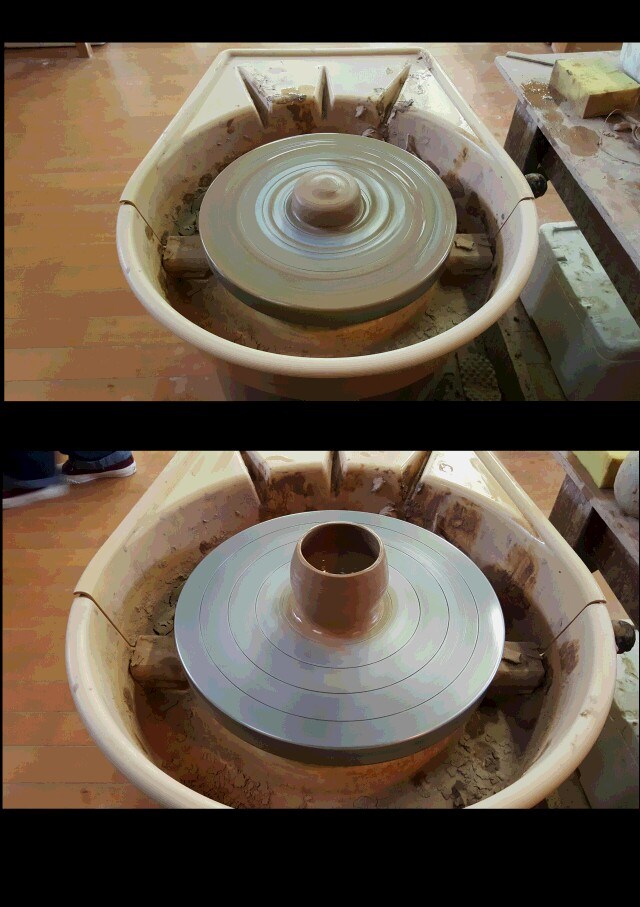 ろくろを回しながら粘土の塊に穴を開けて徐々に器の底を作ってゆきます。
