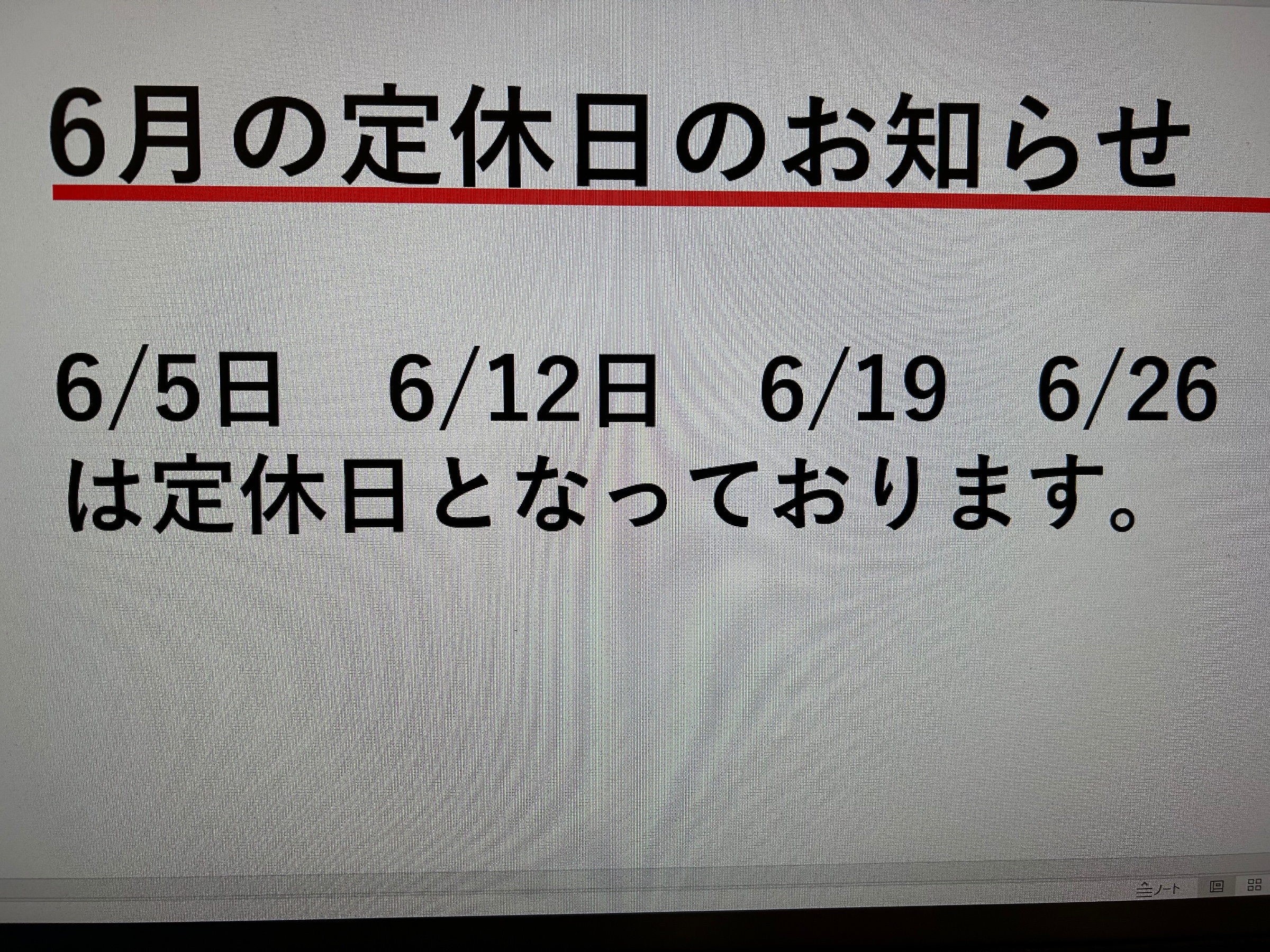 6月の定休日は下記日程になります。 皆様のご来店お待ちしております。 6/5日 (水) 6/12日 (水) 6/19日 (水) 6/26日 (水)