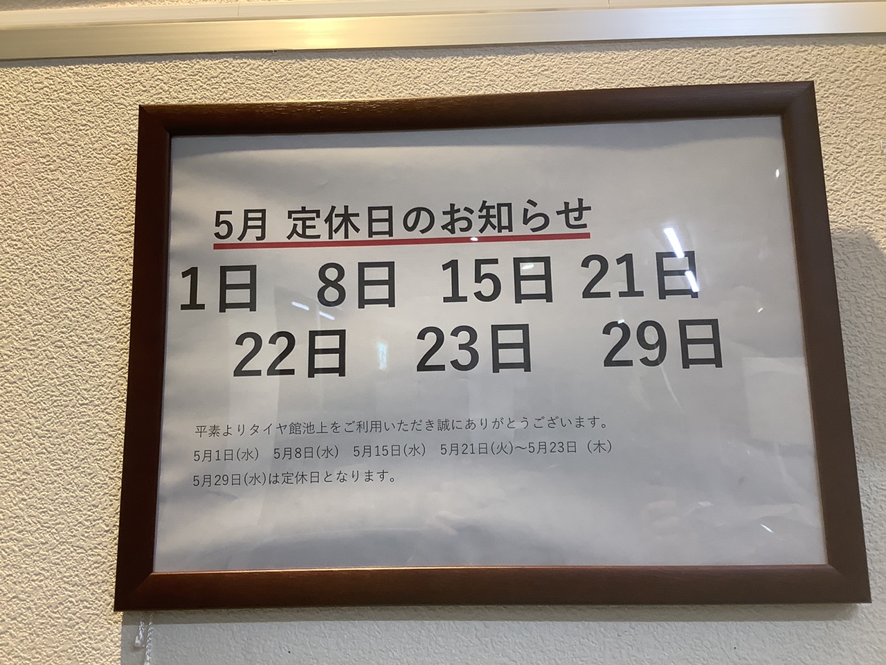 5月の定休日のお知らせになります 皆様のご来店お待ちしております 5月1日 (水) 5月8日 (水) 5月15日 (水) 5月21日 (水) 5月22日 (火) 5月23日 (木) 5月29日 (水)となっております。