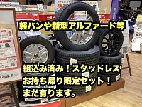 当店も1月に入りスタッドレスタイヤへのお取付けがまだ多いですが、 お時間が無い方やご自身でお取付けが出来る方限定にて、 お持ち帰り用スタッドレスタイヤホイールセットがまだ少なからずございます。 主に、軽バンやコンパクトカーや新型アルファード用もおいてあります。 待ち時間の短縮にも...