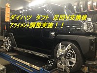 連日、コンパクトカ-や軽自動車の アライメント調整が続いております! 本日は、当店初のアライメント調整となるタフトです。 調整箇所は、基本変わらずフロントのト-のみに なりますので、料金も比較的安く仕上がります。 今回は、足回り交換をされたとの事で調整させて頂きました。 測定結果の時が一...