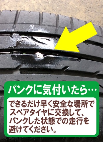 ●パンクに気付かれましたら、できるだけ早く安全な場所でスペアタイヤに交換して頂き、パンクした状態での走行を避けて下さい。