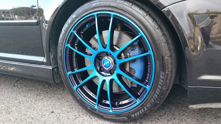 で、今回はホイールをご購入頂いたのですが、ハイパワー車なのでブレーキも強化されており、とても大きなサイズのブレーキキャリパーが装着されています。