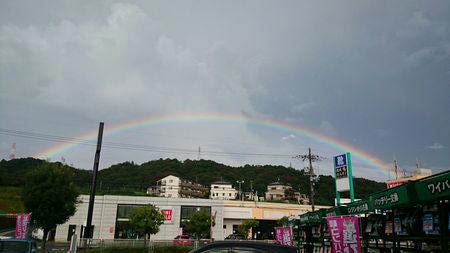 大きな虹! ポスト 2015年9月4日 8月も終わり、秋雨前線が近づいてきているせいか、雨が多いですね。つい先日も、激しい夕立が…。でも、雨が止んでお店の外に出て空を見てみると、そこには綺麗な虹がかかっていました!しかも特大サイズ!いいことありそうですね~♪ 担当:扇田