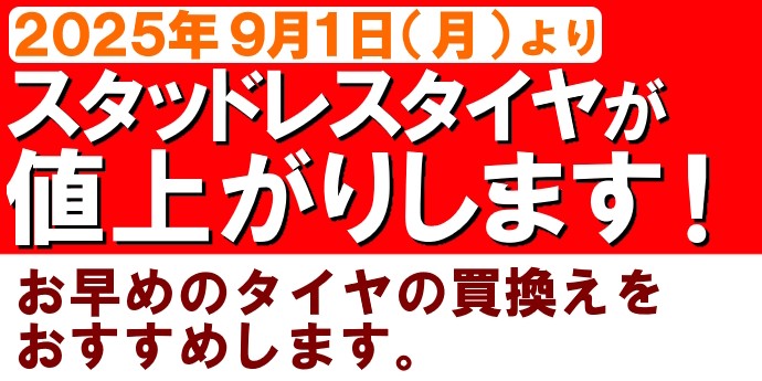 9月より冬タイヤが値上がりします! ポスト 2025年8月5日 ブリヂストンタイヤより発表されておりました冬タイヤの値上げが 間近に迫っております。 値上がり時期は2025年9月1日(月)となります。 今年スタッドレスタイヤの購入を検討されている方は、 値上がり前のご購入をお勧めいたします。 お見積りからだけでも是非お気軽にお立ち寄りください! 関連情報もあわせてご覧ください 国内市販用タイヤの値上げについて