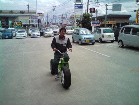 三輪自転車のタイヤが乗用車のタイヤになっており、