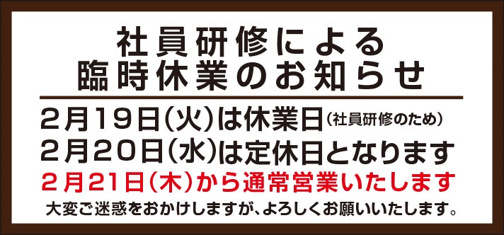 2月19日(火)は臨時休業となります。 ポスト 2019年2月18日 2月19日(火)は社員研修の為 臨時休業とさせて頂きます。 尚、2月20日(水)は定休日を頂き 2月21日(木)より通常営業とさせて頂きます。 ご理解の程、宜しくお願い致します。 カテゴリ:お知らせ