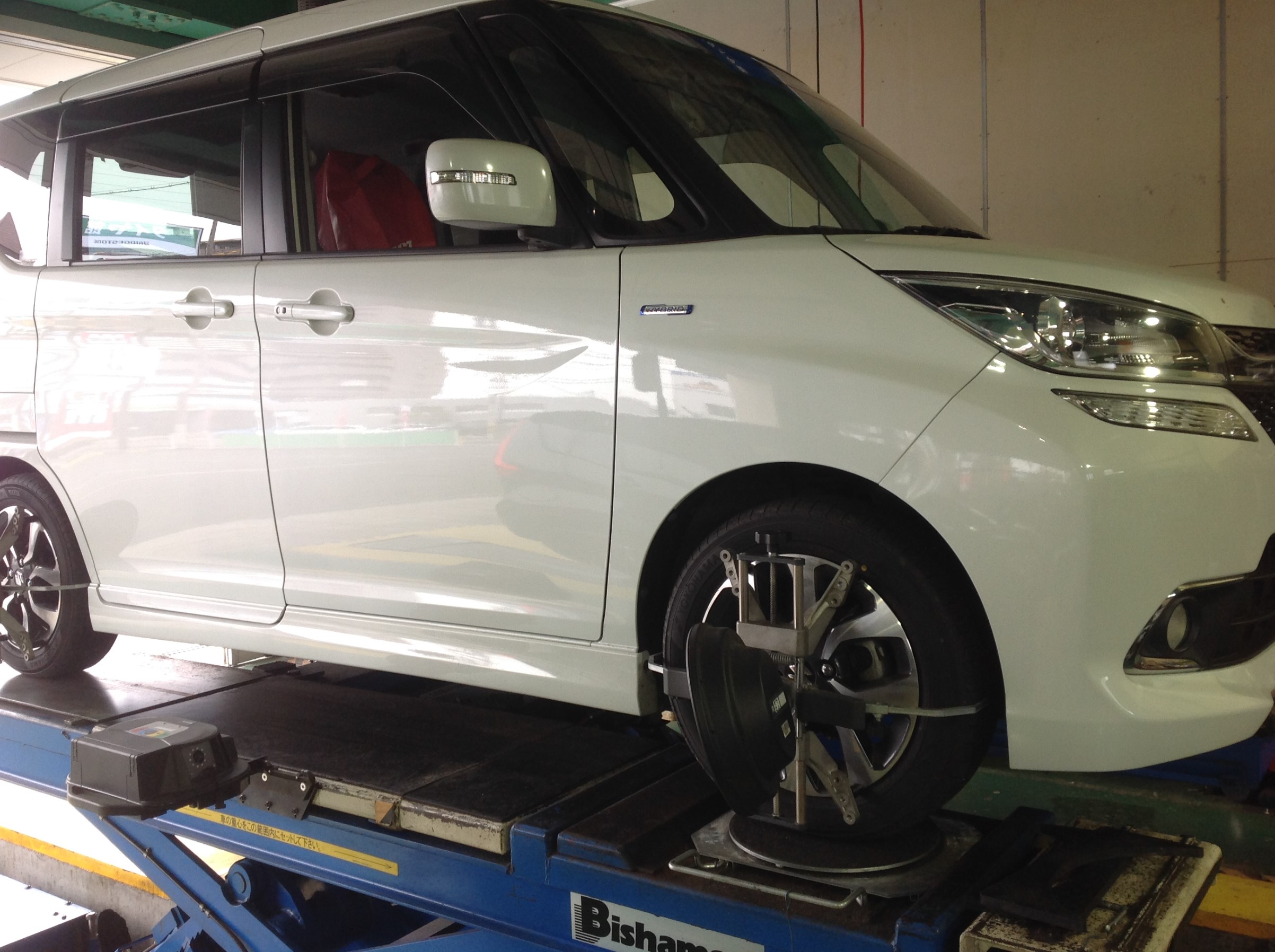 ☆スズキ ソリオバンディット アライメント調整 ポスト 2019年3月25日 四日市市、菰野町周辺にお住まいの皆様、こんにちは! 四日市のタイヤ専門店 タイヤ館生桑です! --------------------------------------------タイヤ交換と アライメントのご紹介です。 車種:スズキ ソリオバンディット 3D4輪トータルアライメント タイヤ交換時はアライメントチェックで、 タイヤとおクルマの性能を引き出しましょう! 担当:清水