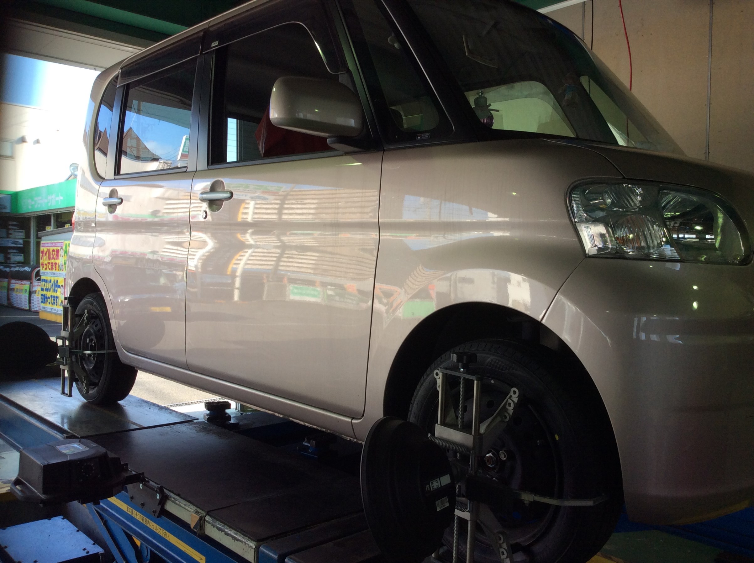 【ダイハツタント】 アライメント調整 当店のHPをご覧いただきありがとうございます。 本日の入庫車両はタントです。 サービス事例にてアライメント調整をご紹介してます。 是非ご覧ください!!