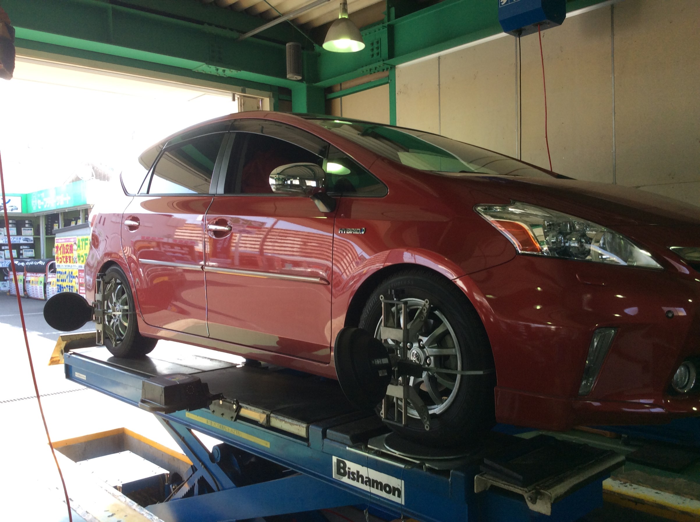 【トヨタプリウスα】 アライメント調整 当店のHPをご覧いただきありがとうございます。 本日の入庫車両はプリウスαです。 サービス事例にてアライメント調整をご紹介してます。 是非ご覧ください!!