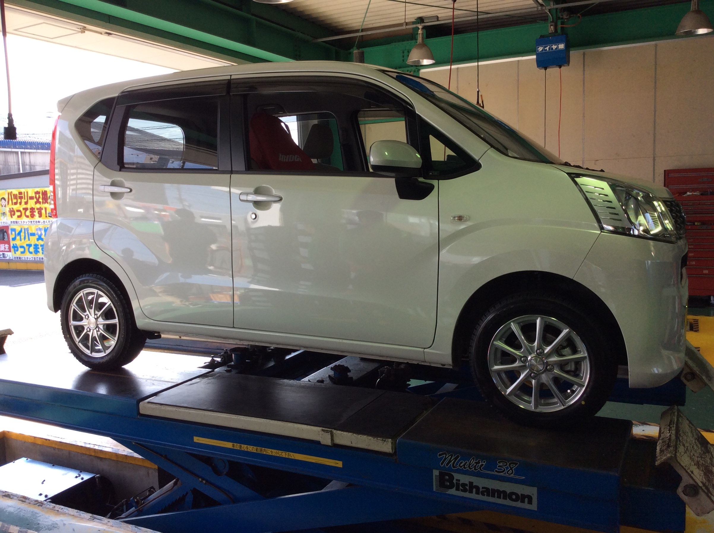 当店のHPをご覧いただきありがとうございます。 本日の入庫車輌はダイハツ ムーヴです。 サービス事例にてスタッドレスタイヤ交換をご紹介してます。 是非ご覧ください!!