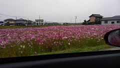 通勤中の光景です。例年より、咲いている箇所が少ないなと思いながら。 車を止め、車内からパシリと! 「秋桜」でした。