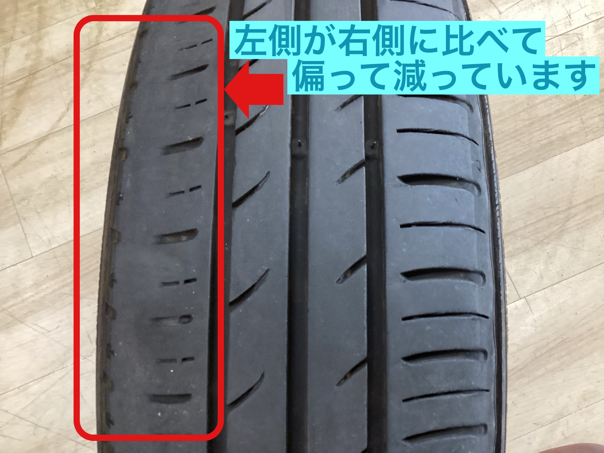 タイヤの状態を確認したところ、タイヤの内側が偏って減っていることがわかりました。