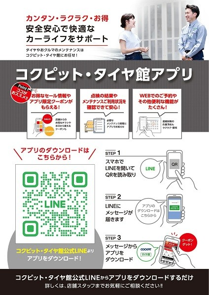 【コクピット・タイヤ館公式LIENやってます♪】 友だち登録で、 ①セール情報やお得なクーポンを配信! ②WEBでの予約が簡単! ③その他便利な機能がたくさんあります!! ご登録は画像のQRコードからお願い致します!