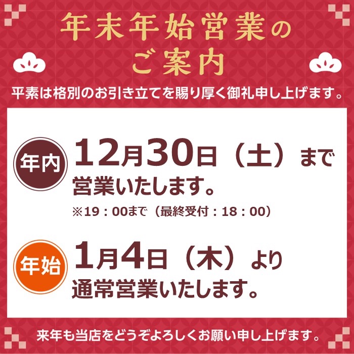 通常:10:30~19:00 *作業受付は終了30分前となります。また、混雑度及び作業内容により作業受付時間が早まることもありますのでご確認ください。